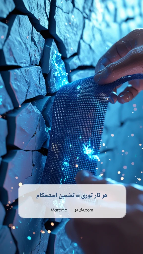 توری مارآمو معمولاً بر اساس استانداردهای صنعتی برای تقویت سنگ و مصارف ساختمانی تولید می شود. ترکیب مرسوم در محصولات رده بالا شامل یک بستر از الیاف شیشه ای مقاوم به قلیا (Alkali-Resistant fiberglass) که با یک امولسیون یا پوشش پلیمری آغشته شده، و گاهی لایه ای از اسکریم یا بافت پلیمری (مثل پلی استر) برای توزیع بار است. این ترکیب باعث می شود توری ضریب ارتجاعی کنترل شده، مقاومت کششی بالا و قابلیت چسبندگی مناسب با رزین های اپوکسی یا پلی استری داشته باشد؛ ویژگی هایی که هنگام نصب پشت اسلب های سنگی یا کاربردهای ترمیمی اهمیت زیادی دارند.